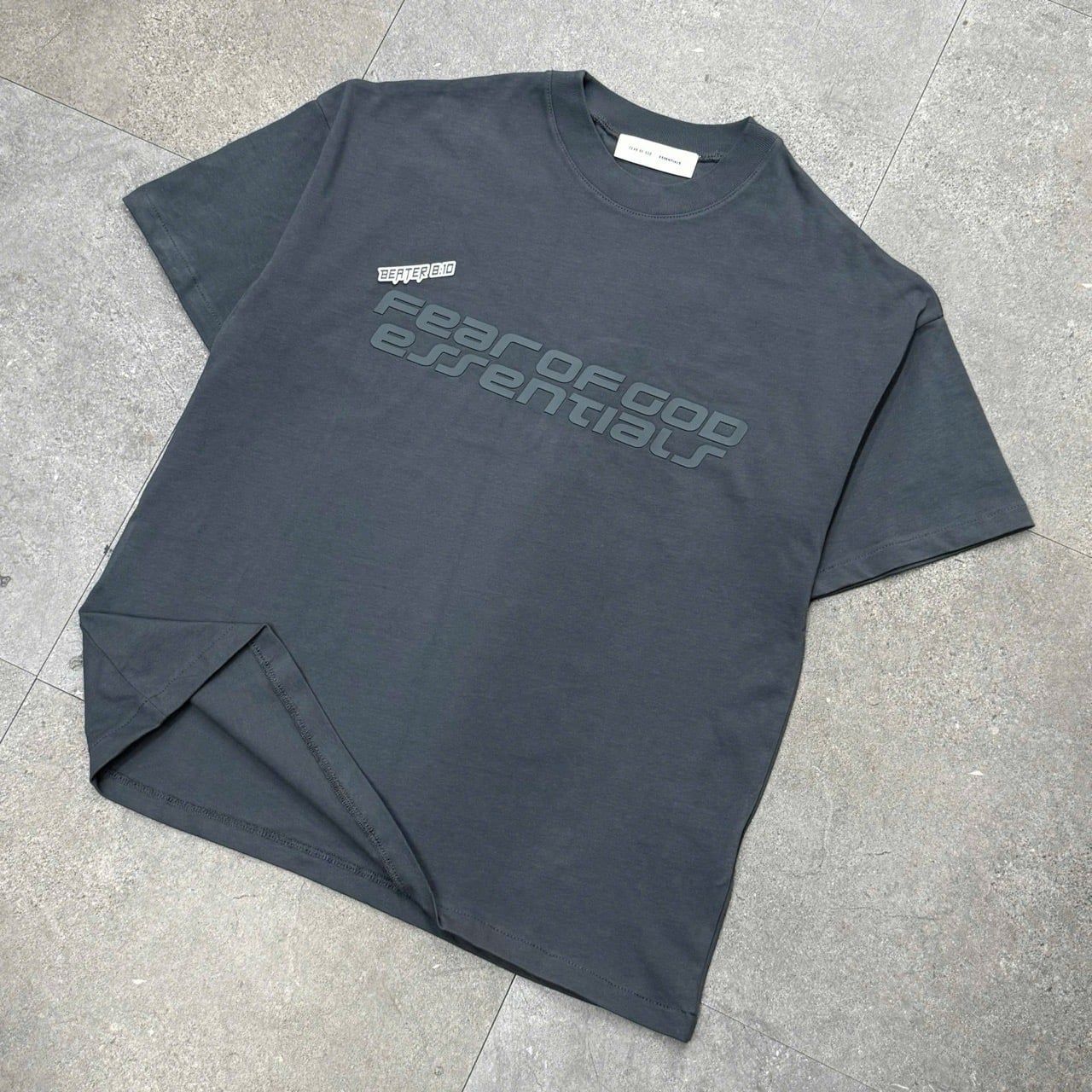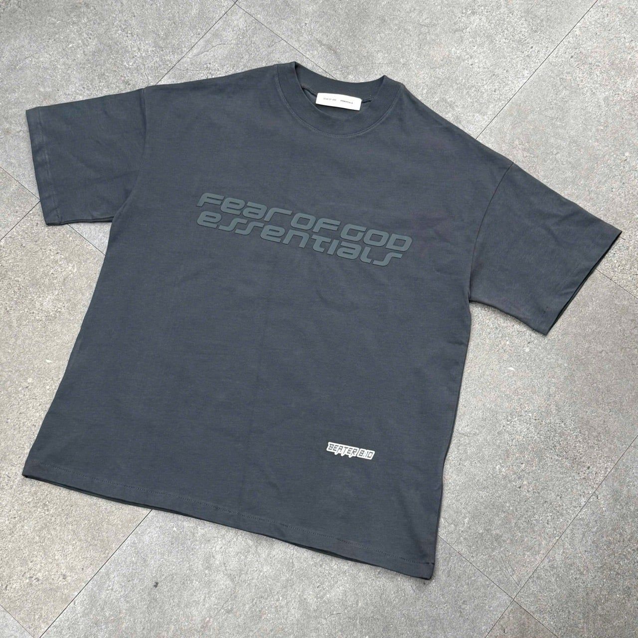 Logo ESSENTIALS tối giản: In/ép cao su tinh tế trước ngực & sau lưng – nhận diện đặc trưng.