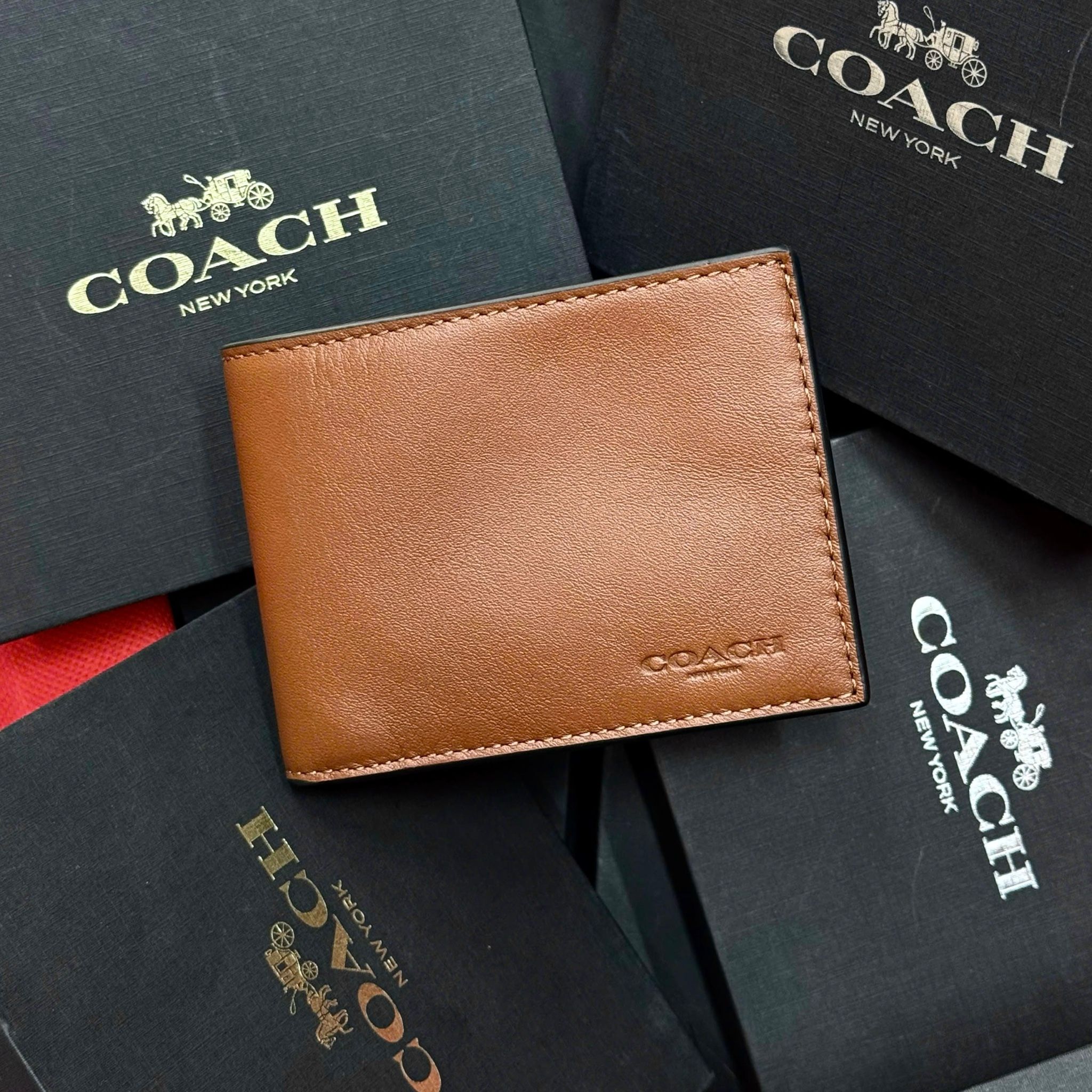 Coach Slim Bill Canvas dáng gập đứng, phiên bản Dark Saddle nâu sẫm cổ điển, mang đến phong cách tinh tế và nam tính cho quý ông hiện đại.