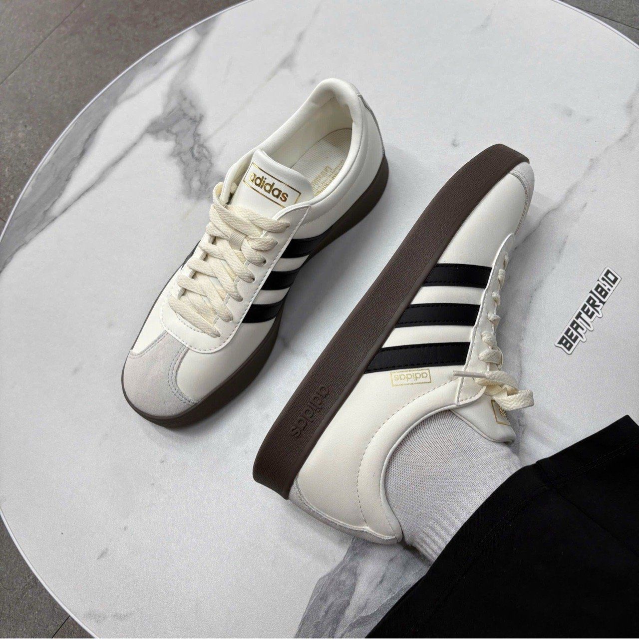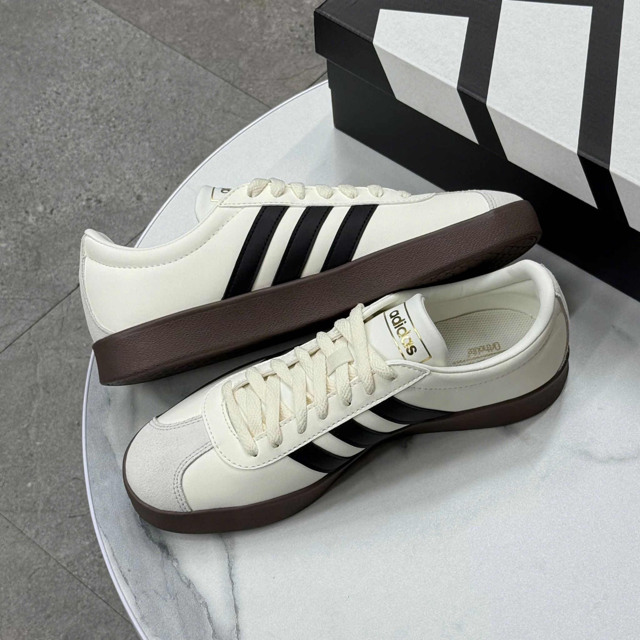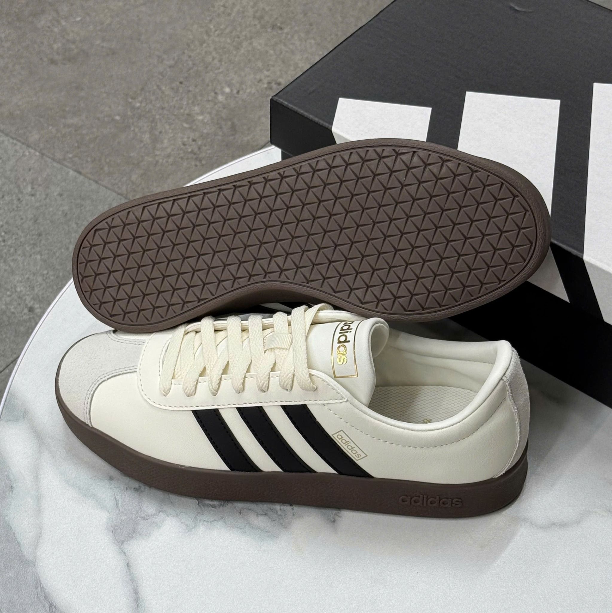 Phối màu kem trắng trang nhã, logo 3 sọc đặc trưng và đế cao su tròn classic – mẫu sneaker này lên chân là auto “gu”. Form dáng gọn, dễ phối đồ, đi học – đi chơi – đi làm đều hợp vibe.
